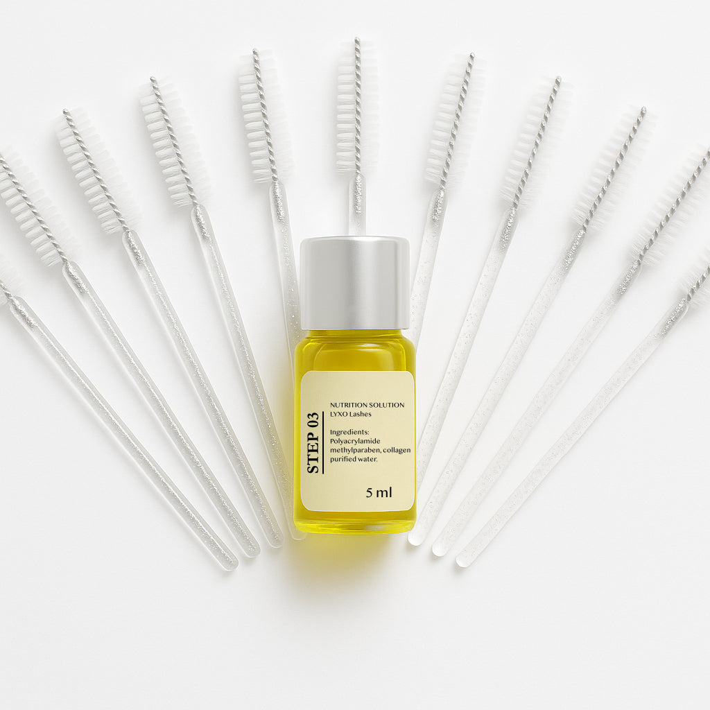Nutrition-vätskan ger näring och tillför fukt till fransar och bryn. Den innehåller kollagen för att återuppbygga strukturen av fransar och bryn efter franslyft och brynlaminering.
