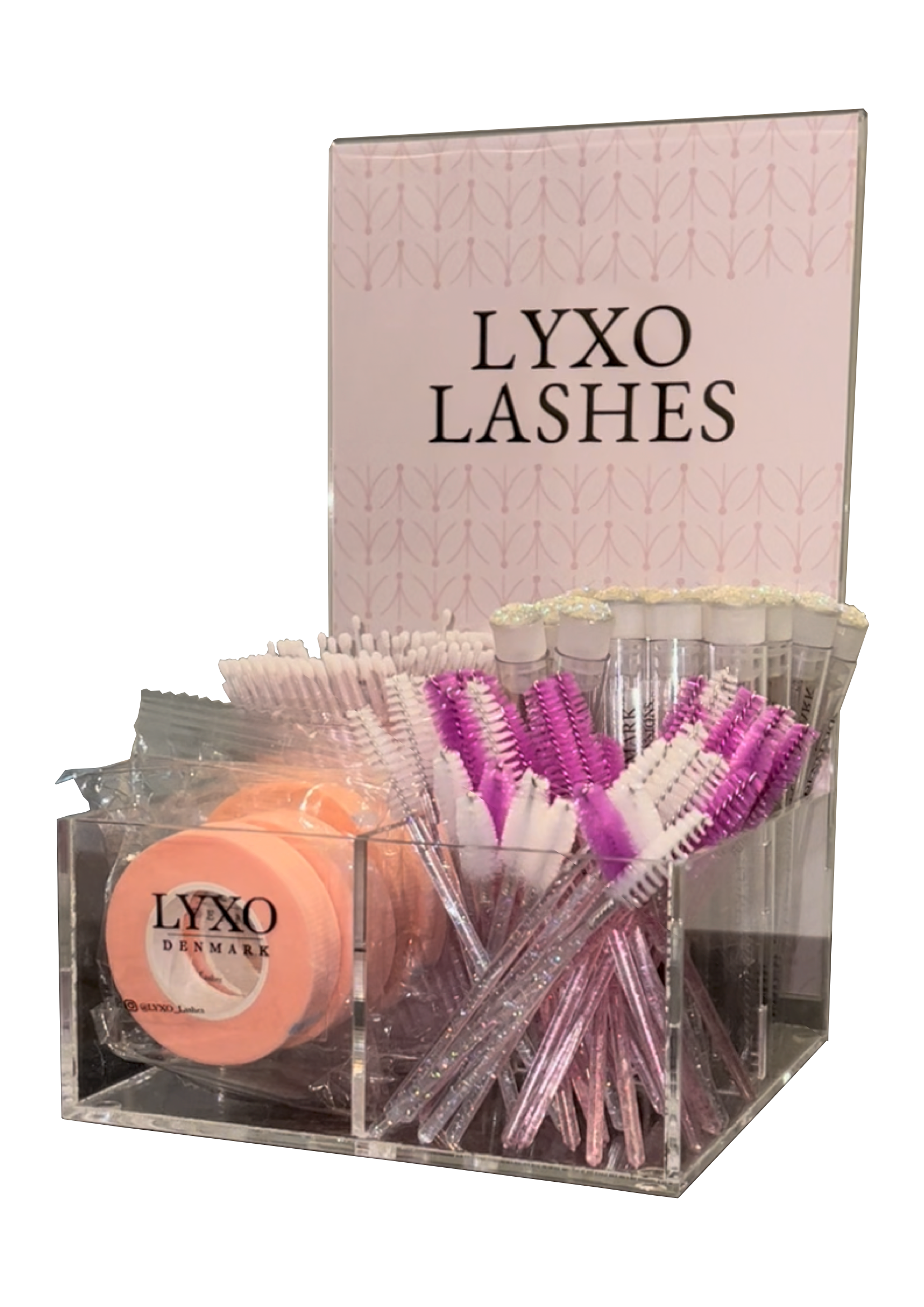 Display för ögonfransförlängningsprodukter. Det bakre locket kan tas bort, så att det bara är de 4 förvaringsfacken. Kartong med logotyp och tryck kan tas bort och ersättas med din egen personliga logotyp.