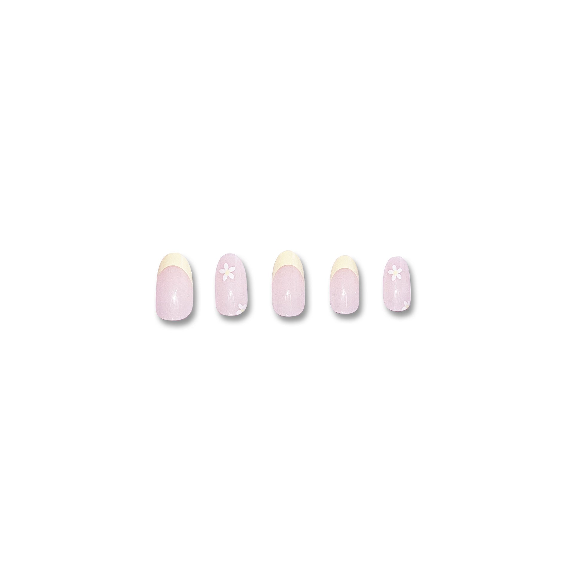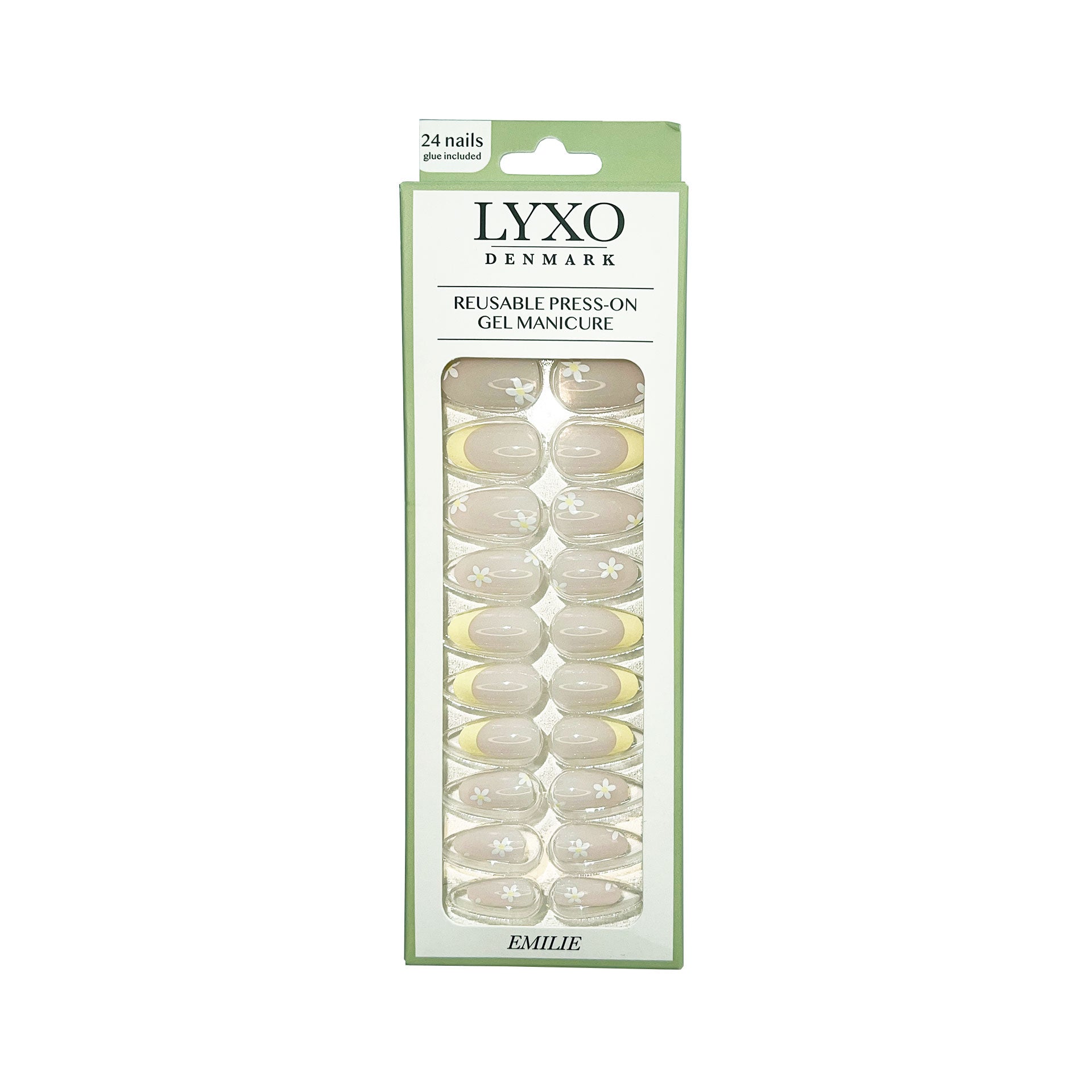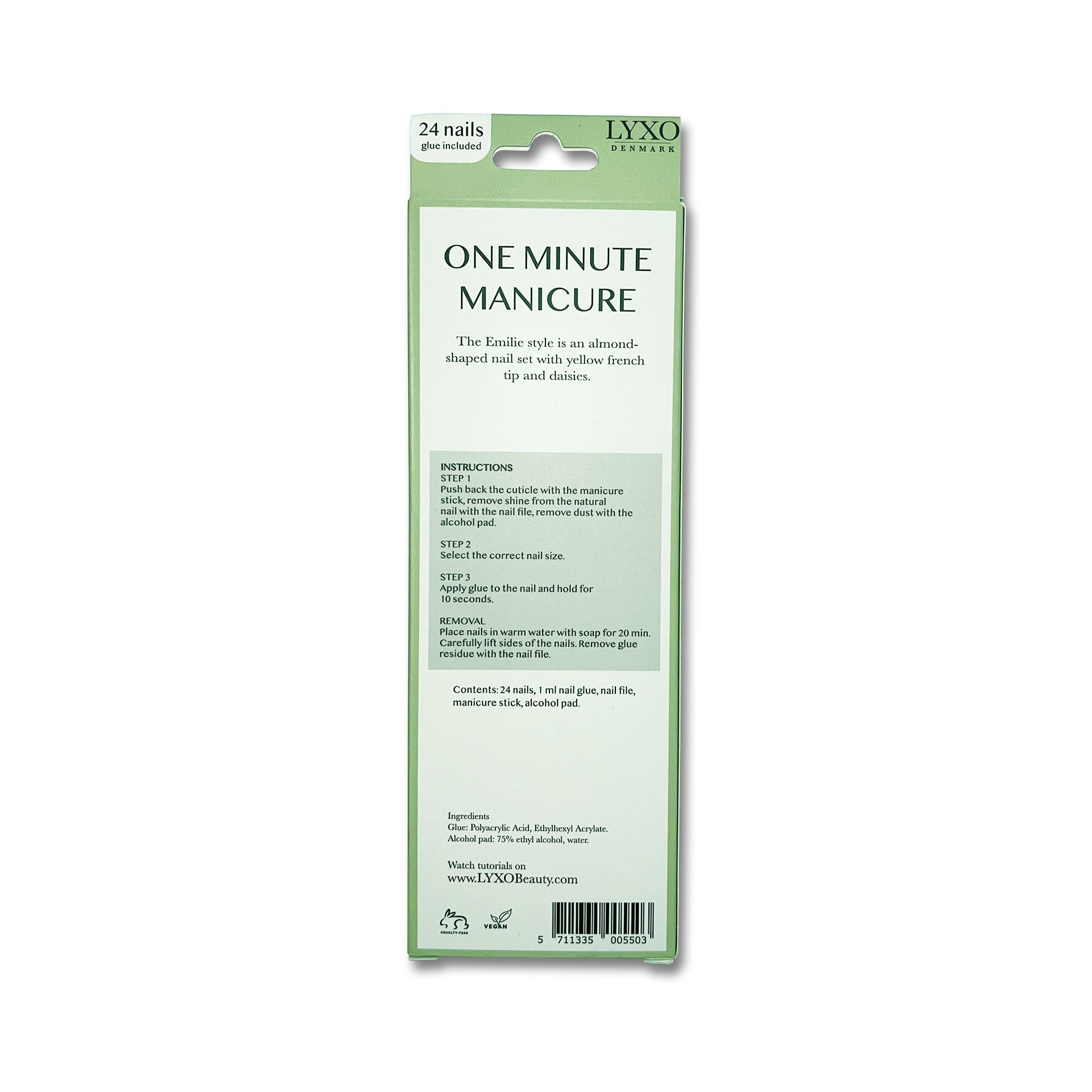 Emilies press-on gel manikyr är mandelformade naglar med gula franska spetsar och t osmyckade blommor.