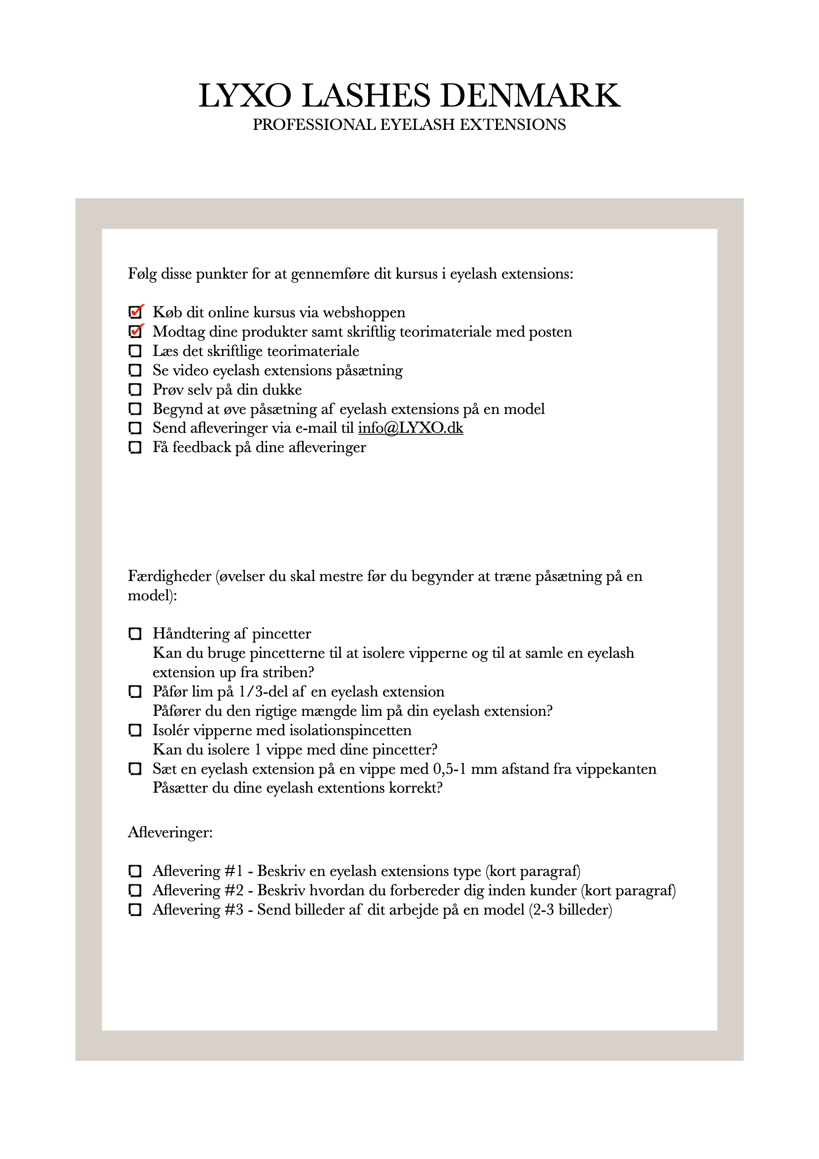 Bli en certifierad LYXO Beauty ögonfransförlängningsstylist genom vår onlinekurs. Nu kan du ta din utbildning när det passar dig bäst. Genom kursen är det enkelt och snabbt att skriva frågor till en utbildare, så att du kan gå igenom kursen i din egen takt med privatlektioner.