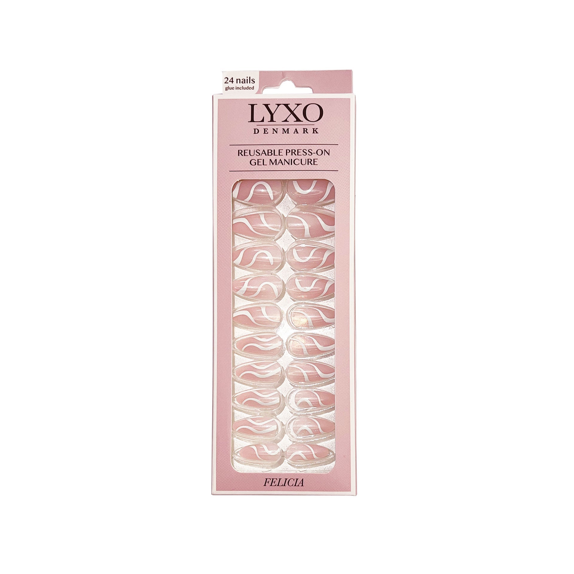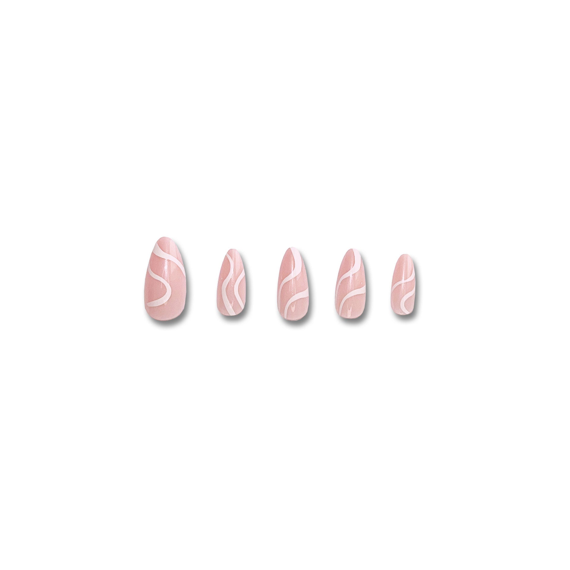 Felicias press-on gel manikyr är mandelformade naglar med en babyrosa bakgrund och abstrakta vita virvlar.